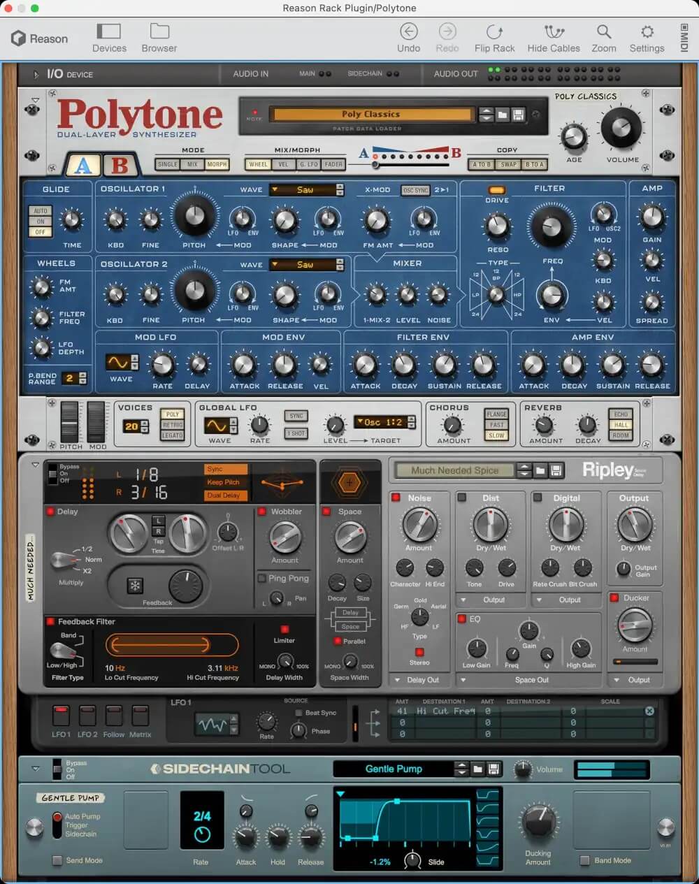 The package includes 66 devices covering the full range of what Reason Studios builds. On the instrument side you’ve got Polytone (dual-layer analog-inspired synth), Europa (wavetable), Thor (polysonic with six oscillator types), Malström (graintable), Subtractor (analog subtractive), Kong (drum designer), Redrum (drum computer), Mimic (creative sampler), NN-XT (advanced sampler), Dr. Octo Rex (REX loop player), Radical Piano, and Humana (vocal ensemble). Six Player MIDI FX handle real-time performance transformation — including Beat Map, Dual Arpeggio, Note Echo, and Scales & Chords, plus Note Tool and Random Tool.
